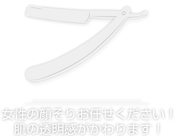 理容室ならではのシェービング「お顔そり」など、男性のみならず、女性のお客様も体験されてみませんか?月に1度「お顔そり」をする事で、肌のキメや、透明感がお化粧ののりがとてもよくなります。男性のヒゲのスタイリング等もおこなっております。